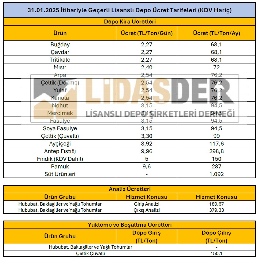 31.01.2025 tarihinden itibaren geçerli olacak depo kira ücretleri ve teminat tarifesi yayımlanmıştır.